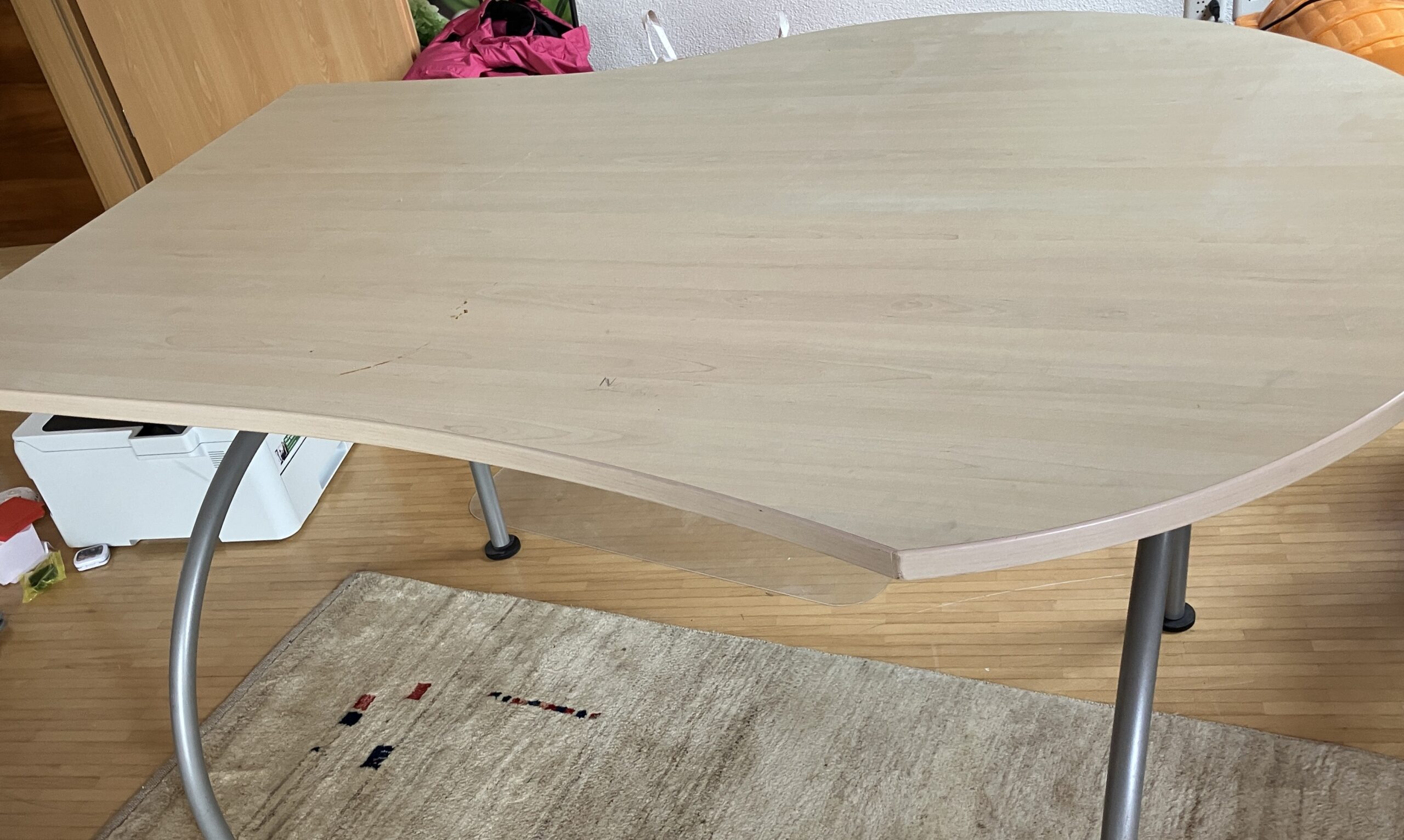 Bürotisch mit Kunstharzplatte und verstellbaren Metallbeinen, gebraucht, sucht neue Nutzer. Masse: 130 (B) x 80 / 110 (T) x ca. 60 / 80 (H). Bei uns muss er wegen Platzmangel weichen.