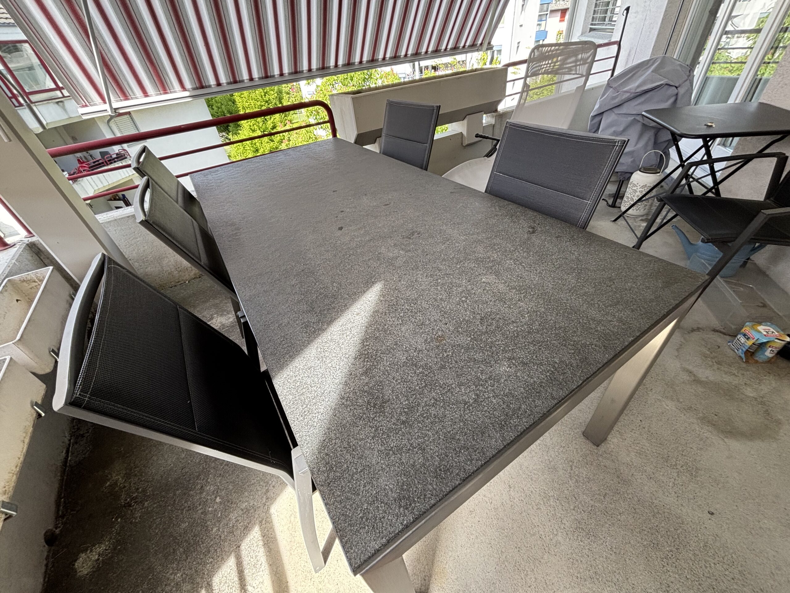 zu verkaufen: Granitgartentisch mit Stahlgestell (90x200cm) neuwertig und 6 dazupassende schwarze Gartenstühle, kann gerne besichtigt werden, muss abgeholt werden