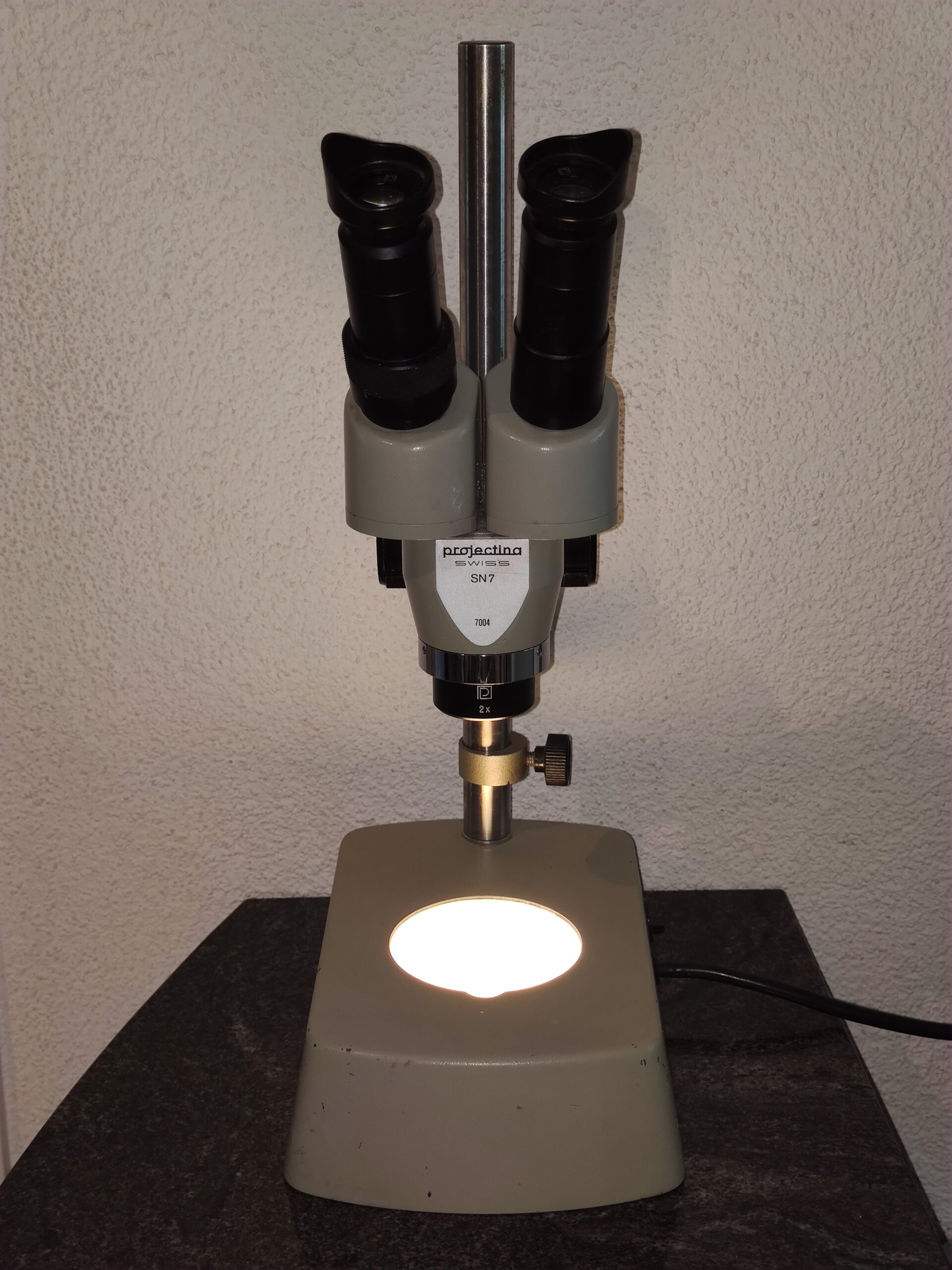 Im Angebot steht ein Mikroskop der Marke Projektina (Heerbrugg, Schweiz), Typ SN7 mit 20 facher Vergrösserung. Mitgeliefert wird ein Stativ mit Durchlichtsockel.