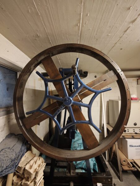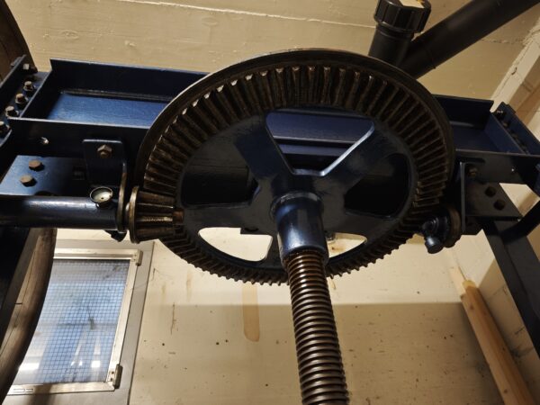 Die Mostpresse ist in einem Super Zustand: Die blaue Hammerschlagfarbe schützt gut vor Rost. Alle Zahnungen und die Pressschraube sind ganz und gefettet. Der Eichentisch (105 mal 105 cm) ist ebenfalls top in Form. Masse: H 220 cm B 170 cm T ca. 110 cm.