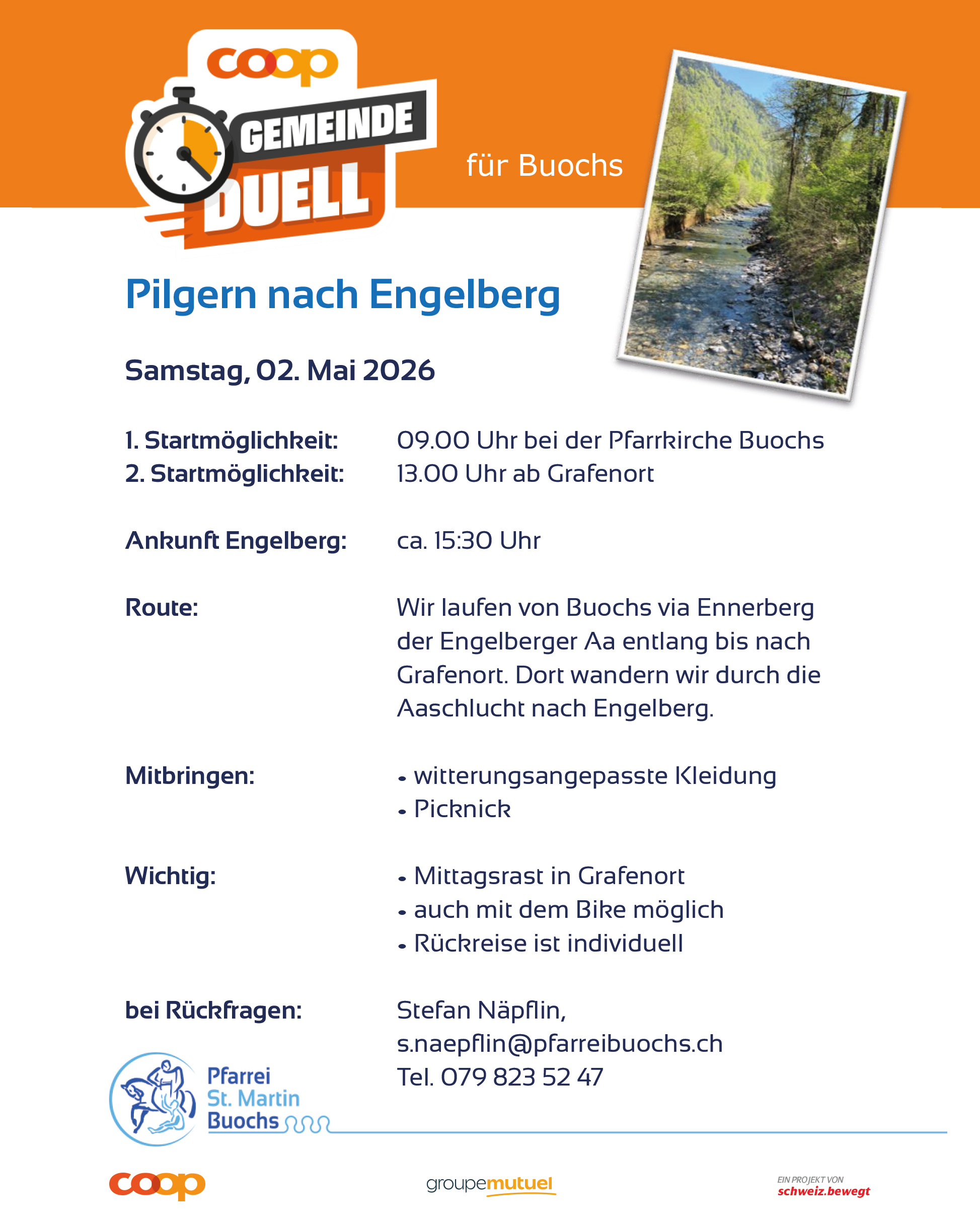 Beim Pilgern nach Engelberg sammeln wir für Buochs Bewegungsminuten. Der gemeinsame Weg und die Freude an der Bewegung stehen im Zentrum. Wir treffen uns um 09.00 Uhr in Buochs bei der Pfarrkirche oder um 13.00 Uhr in Grafenort und laufen gemeinsam der Engelberger-Aa entlang nach Engelberg. Weitere Informationen finden Sie unter https://pfarreibuochs.ch. Keine Anmeldung erforderlich.