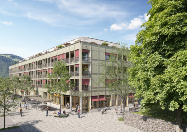 Im Erdgeschoss der neuen Überbauung neben dem Landsgemeindeplatz in Oberdorf eröffnet Ende April ein neuer Migros-Supermarkt. © Arlewo AG